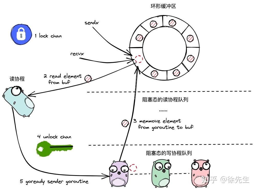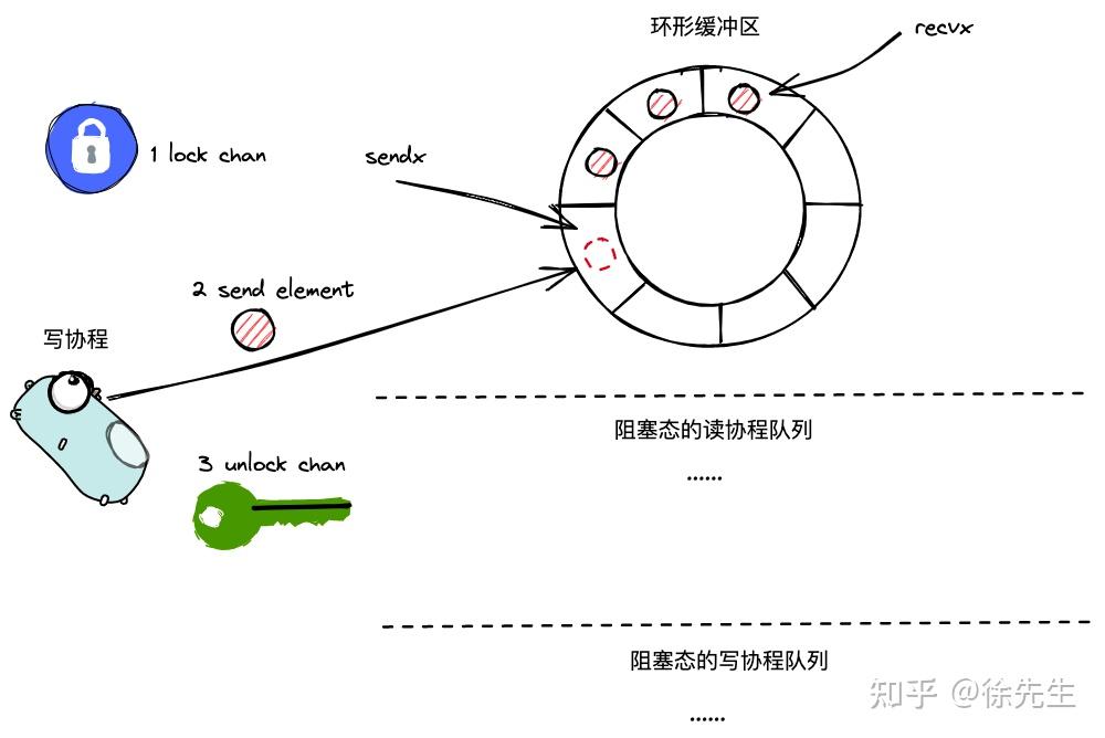 在 hchan 结构体中,使用以下字段组成了一个环形缓存区: