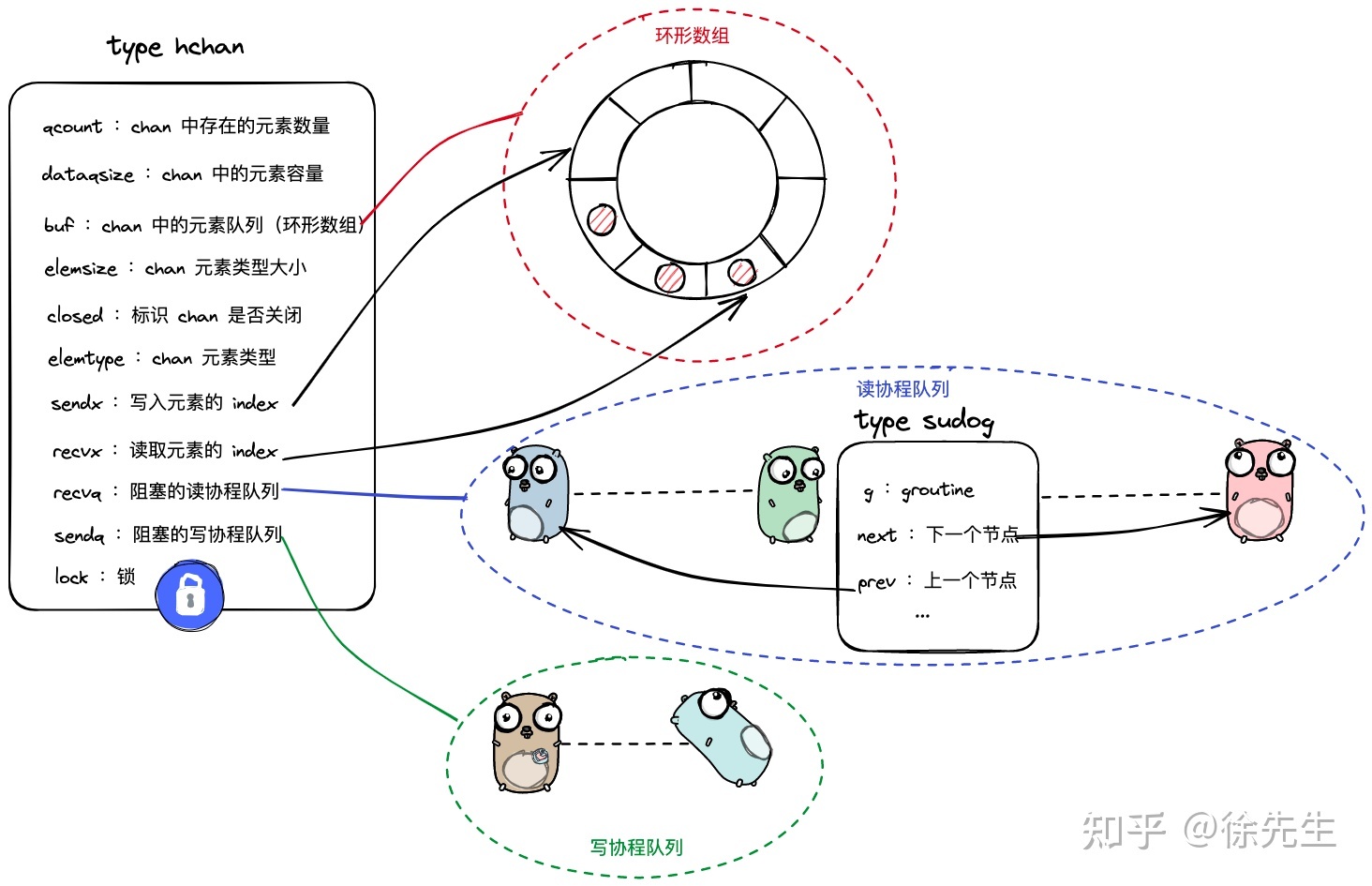 这个 lock mutex 用来保护 hchan struct 的所有字段,所有协程想要操作 hchan 这个结构体的内容,就需要加这个 mutex 锁。