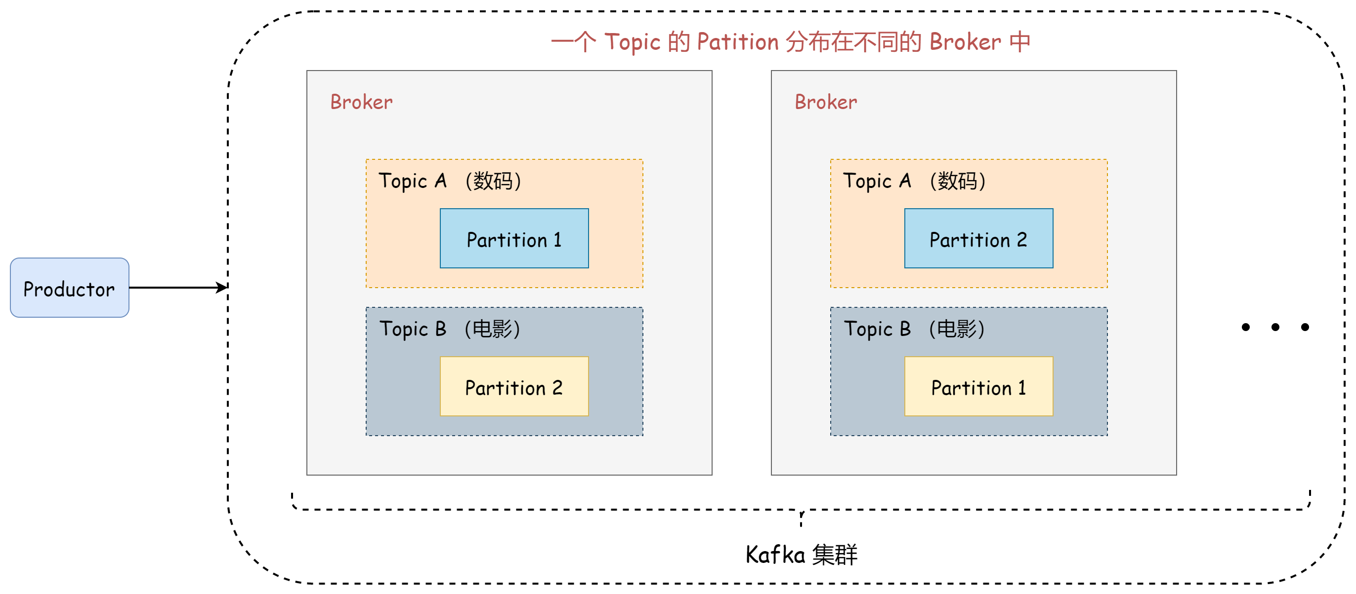 一个 Topic 会被分为多个 Partition,这些 Partition 会分布在不同的 Broker 中。