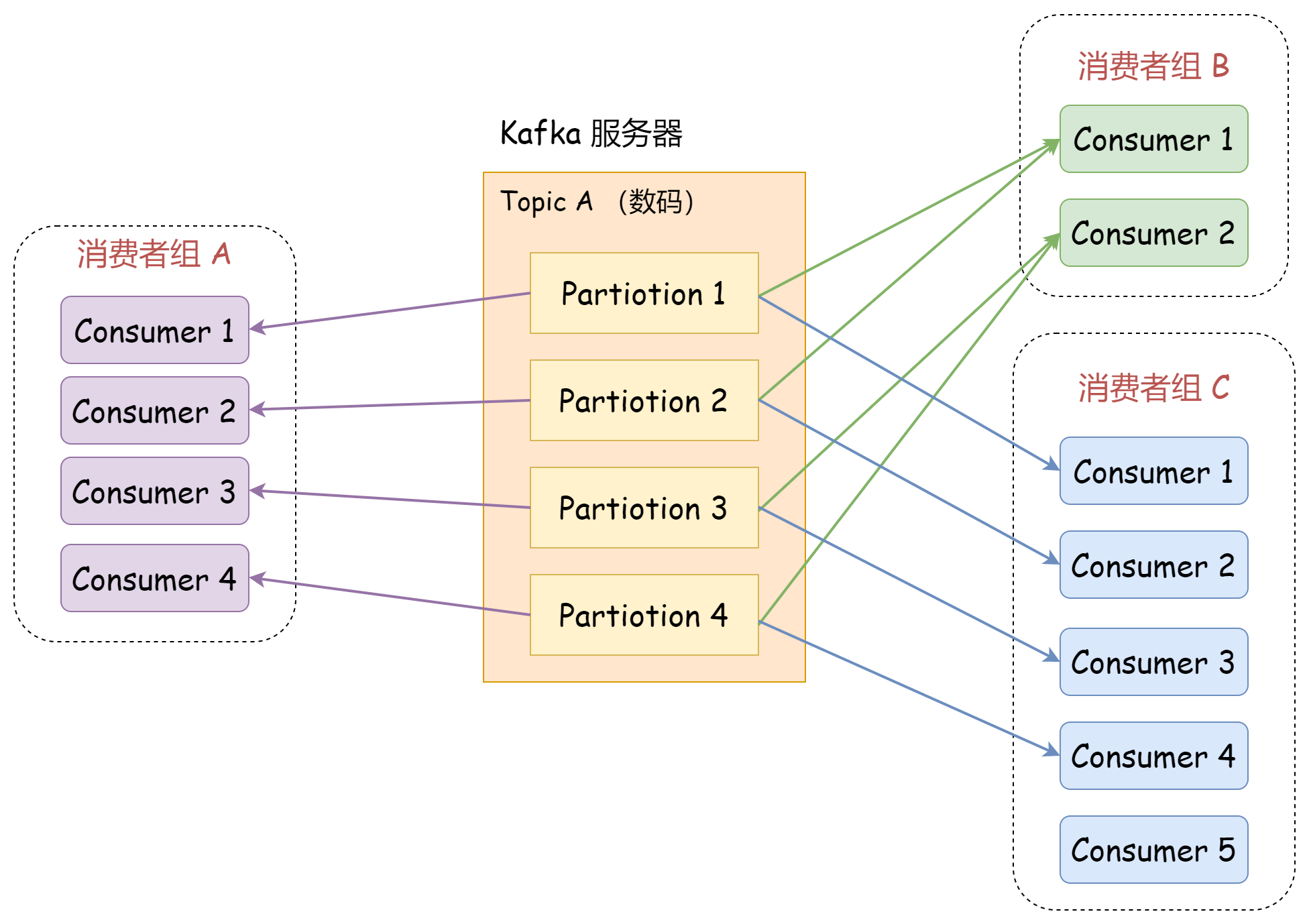 Kafka 引入了消费者组 Consumer Group 的概念,每一个消费者都有一个对应的消费者组。组间进行广播消费,组内进行集群消费。同时限定:「每个 Partition 只能由消费者组中的一个消费者进行消费」。