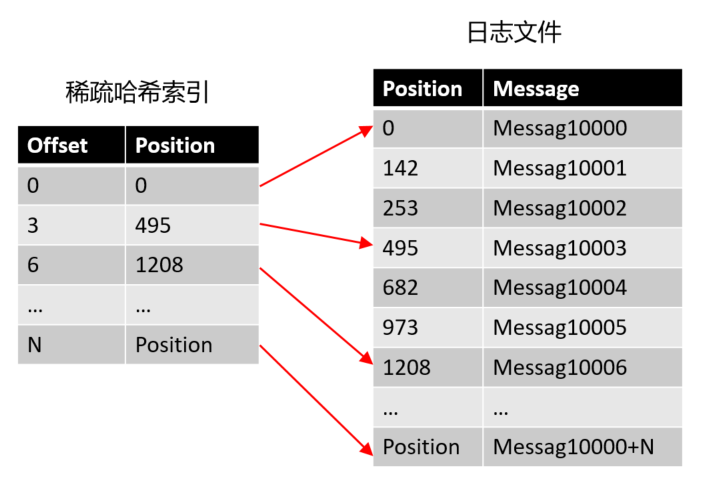 为了避免哈希索引常驻内存消耗过多空间的问题,将消息划分为若干个块 block,每个索引需要定位 block 块中的第一条消息的 offset 即可(稀疏索引), 然后在 block 中顺序查找。
