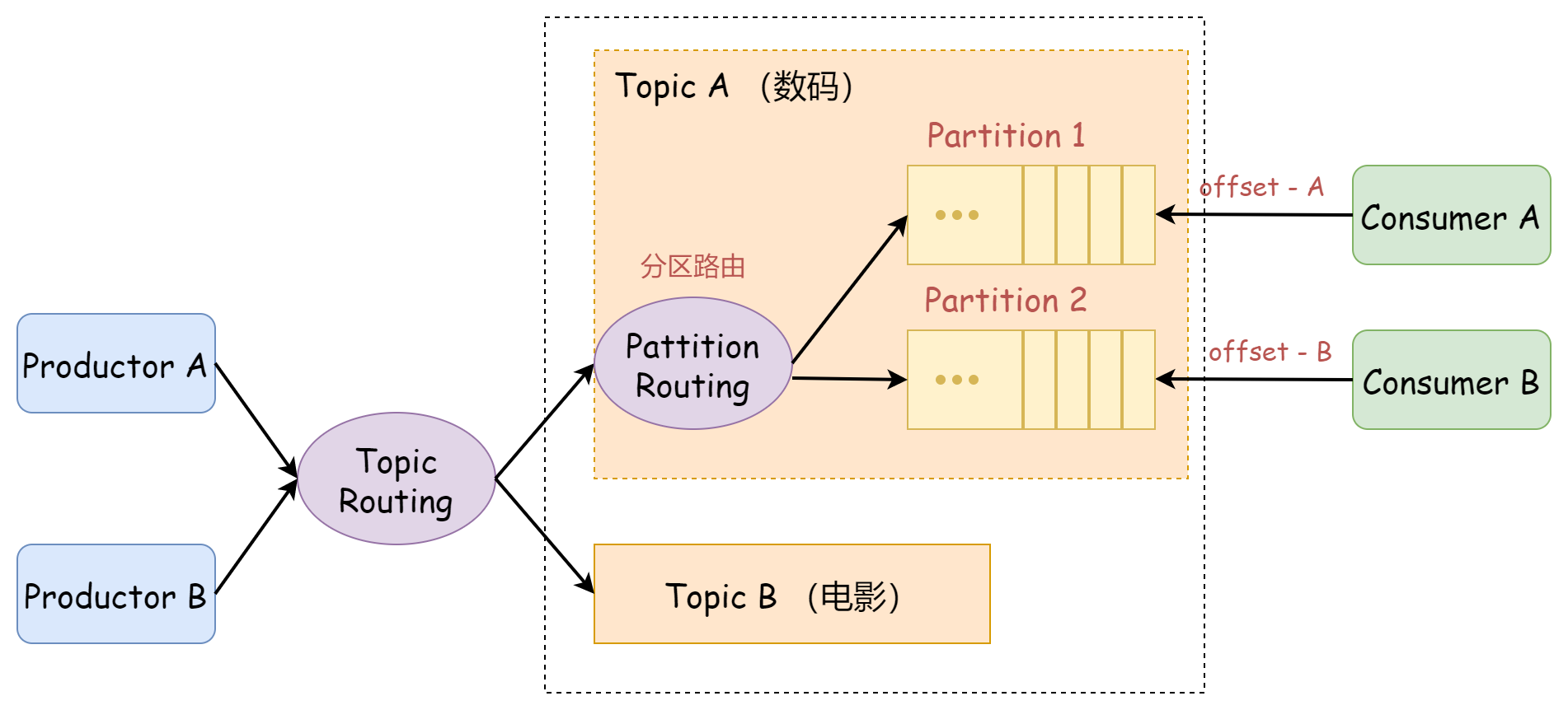 在 Kafka 中,同样采取了水平拆分的方案,将拆分后的数据子集称为 Partition 分区。各个分区的数据集合即为全量数据。