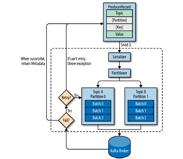 RecordMetaData 对象,包含主题和分区的信息 - 写入失败,会返回一个错误,生产者收到错误之后会尝试重新发送,多次失败直接返回错误信息
